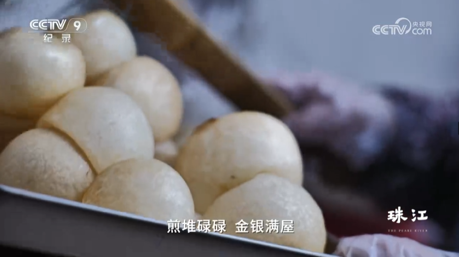 煎堆表皮金黄,犹如黄金般灿烂,一口咬下去,仿佛从香脆中吃出团圆富贵,在广府人眼中,煎堆是好意头食品,成为招待客人、串门送礼的必备年货。